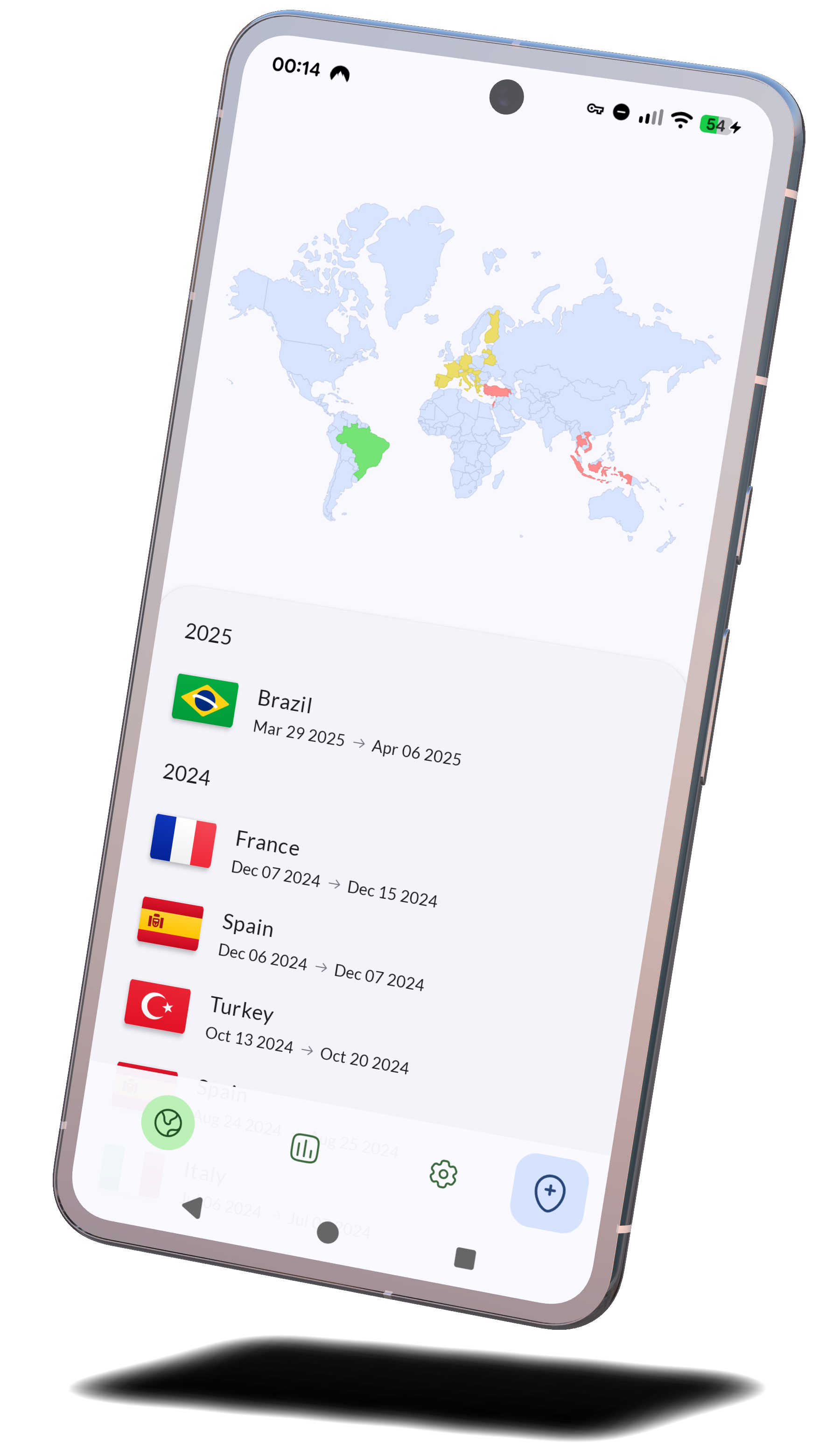 Automatically track trips, "color in" the globe, and manage your time abroad.